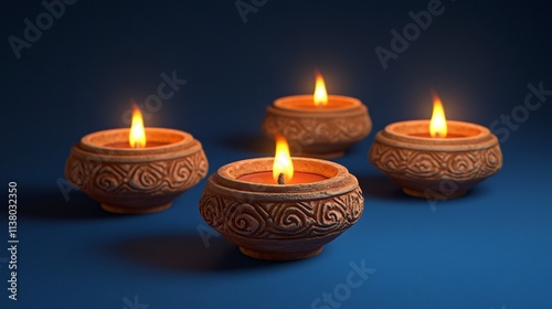 Four intricately designed terracotta candles glowing softly against a dark blue background.