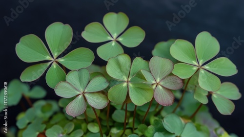 Four leaf clover Oxalis tetraphylla plant with vibrant green leaves and red veins against a dark background showcasing its unique beauty