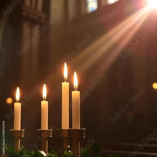 Four lit advent candles in a church, soft light, hazy atmosphere bright lens flare, light streaks, vibrant warm colors, glowing effect