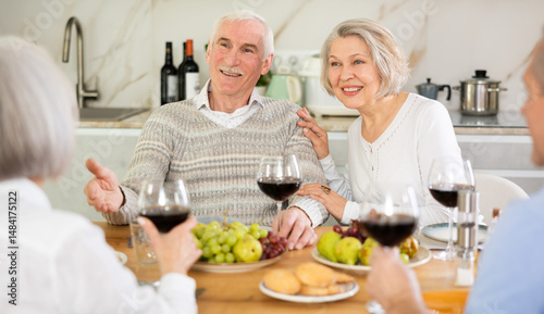Four mature male and female friends are sitting at table, chatting sweetly, discussing and telling news, sharing plans. Senior women and men celebrates housewarming party with female relative.