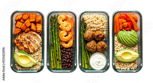 container, health food, chicken, shrimp, vegetable, avocado, asparagus, grain, meatball, yogurt, carrot, red pepper, diet, nourishment, balanced, lunch, dinner, food, cooked, grilled, protein, fiber, vitamin, mineral, dieting, food preparation, food photography, still life, culinary, cooking, delicious