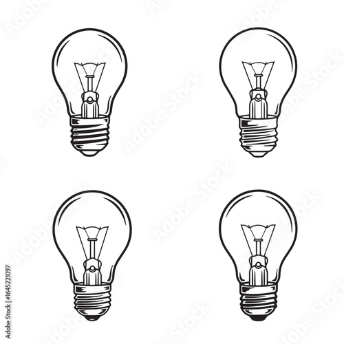Four monochrome outline illustrations of classic light bulbs isolated on white background