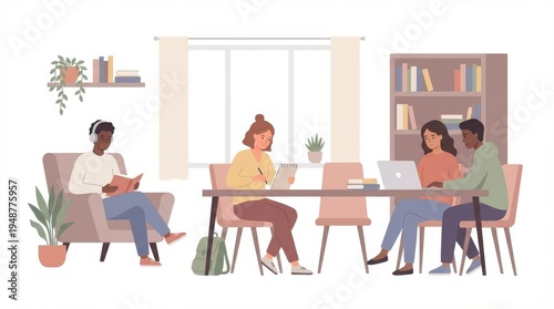 people, group, work, together, collaborate, home, office, indoor, meeting, team, business, casual attire, lifestyle, adult, friends, colleague, workspace, cooperation, communication, productivity, technology, computer, laptop, notebook, paper, crayons, plant, furniture, chair, table, bookshelf, window, curtain, wall, shelf, decor, interior, design, planning, strategy, partnership, company, enterprise, organisation, community, connection, interaction, conversation, exchange