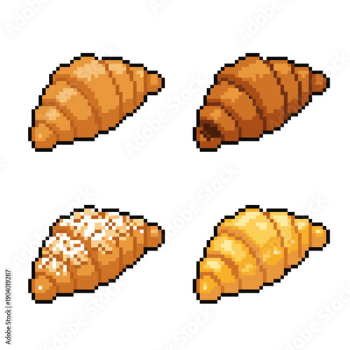Four pixel art illustrations of croissants, including plain, chocolate, powdered sugar, and glazed varieties.