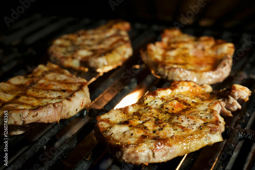 bar-b-q, barbecuing, blur, blurred, broiled, broiling, dish, food and drink, grilled, grilled meat, grilling, main course, meat, meat dish, out of focus, outdoors, outside, pork meat, savoury, soft focus, steak