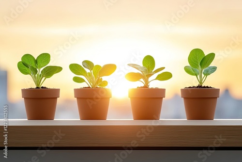 Four potted plants on a windowsill with a sunset view, symbolizing growth and tranquility