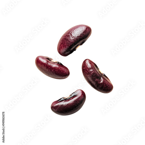 Four red kidney beans falling on a black background.