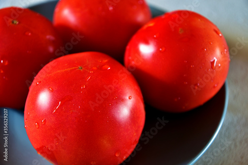 Four red ripe tomatoes on a blue plate. Close-up. Side view.