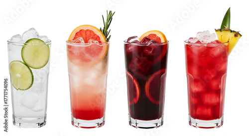 Four refreshing tall cocktails with fruit garnish isolated on transparent background