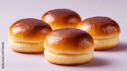Four round golden brown baked buns with a shiny smooth crust presented on a light lavender background