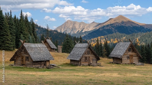 Four rustic wooden cabins in a mountain meadow.
