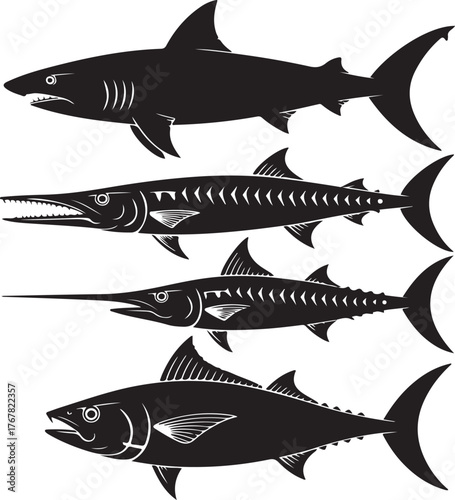 Four Silhouette Predator Fish Including Shark Barracuda Marlin Tuna shark silhouette