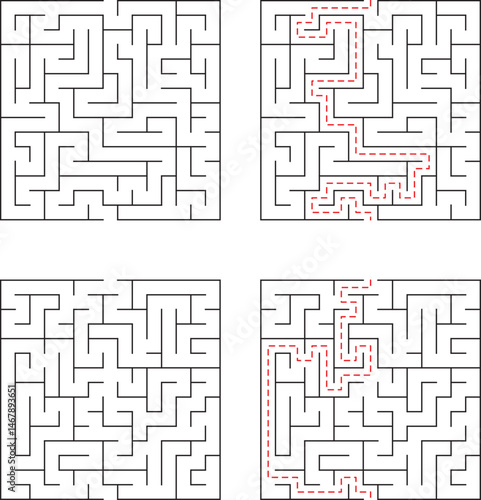 Four square mazes demonstrating solutions to complex puzzles with clear paths and guidance