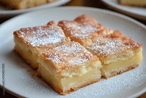 dessert, baked goods, pastry, food, homemade, square, powdered sugar, icing sugar, sugar, plate, serving, portion, creamy, filling, crust, golden brown, delicious, tasty, tempting, sweet, rich, indulgent, confectionery, bakery, cafes, eatery, afternoon tea, snack, treat, party food, celebration, birthday, holiday, festive, lemon, citrous, yellow, white, background, closeup, food photography, still life, cookery, epicure