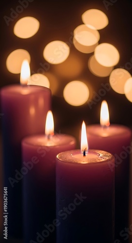 Four tall purple candles with gentle flames burning, set against a backdrop of soft, warm bokeh lights, evoking a peaceful and serene atmosphere.