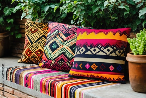 Four vibrant, geometric patterned throw pillows rest on a multicolored striped textile atop a stone bench, nestled amongst lush greenery and a terracotta pot
