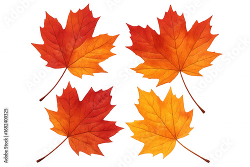 Four vibrant maple leaves displaying stunning autumn colors of red, orange, and yellow, isolated against a transparent background