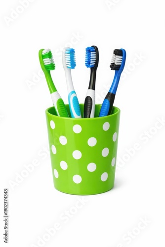 Four vibrant toothbrushes in green polka dot cup isolated on white background studio photo