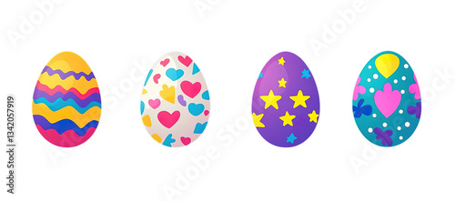 Four vividly colored Easter eggs featuring wave, heart, star, and heart - dot patterns, perfect for Easter - inspired, decorative, and celebratory designs.