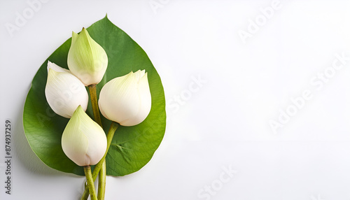 Four White Lotus Buds on a Green Leaf Against a White Background