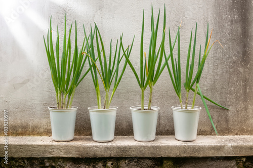 Four white pots of scallions or spring onions growing against a concrete wall.