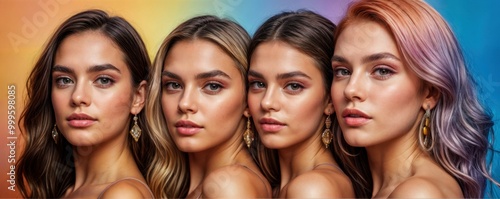 Four women stand together in front of a rainbow background