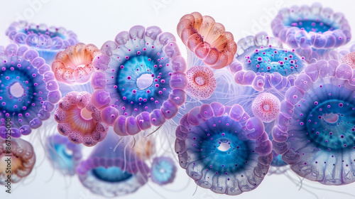 fractal image of a flower. 3d abstract cells bacteria virus under microscope isolated white background. Dreamy purple sea ocean corals. Science microbiology biology concept. Medicine desease