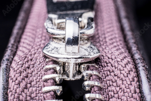 Fragment of a metal zipper close-up. Soft focus