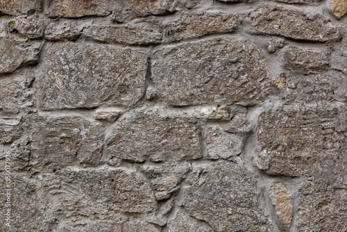 fragment of masonry with gray uneven stones bonded with cement mortar to form a textured background