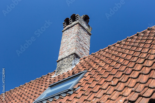 attic, blue, building, ceramic, chimney, clay, detail, exterior, flue, fragment, funnel, mansard, old, pattern, red, roof, roofing, rural, sky, sunny, terracotta, tile, top, traditional, village, weather, window