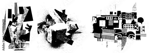 Fragmented vector shapes with halftone textures, bold black forms, graphic composition, modern art elements, abstract design.