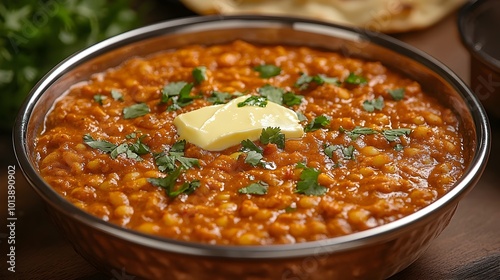 food, dish, meal, lentil, curry, indian, spice, vegetarian, traditional, cooking, pot, bowl, plate, butter, coriander, garnish, creamy, rich, warm, hot, soft, lighting, inviting, atmosphere, copy, space, cookery, delicious, appetising, savoury, flavorful, fragrant, hearty, wholesome, comforting, homemade, aromatic, stewed, rustic, authentic, culinary, epicure, nourishing, satisfying