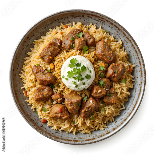 Fragrant mutton biryani paired with cool raita, richly spiced and served hot, isolated