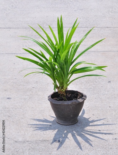 Fragrant pandanus and green leaves on brown pot on natural light background.