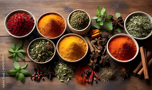 Fragrant spices and herbs in bowls, top view. on a wooden board