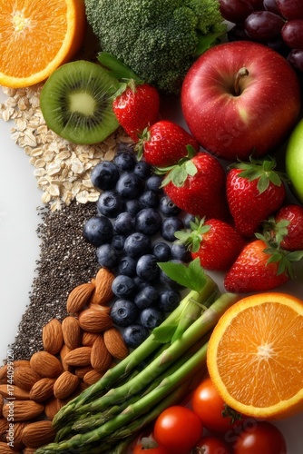 Frame made from healthy food ingredients, apples, grapes, strawberries, blueberries, oranges, broccoli, asparagus, tomatoes, pepper, almonds, oats, chia seeds
