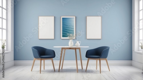 frame mockup in scandinavian dining room, minimal design on white and blue interior background