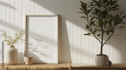 three-dimensional, render, mock-up, blank space, picture frame, scandinavian, room, interior, wood, table, plant, brown, white, design, photo frame