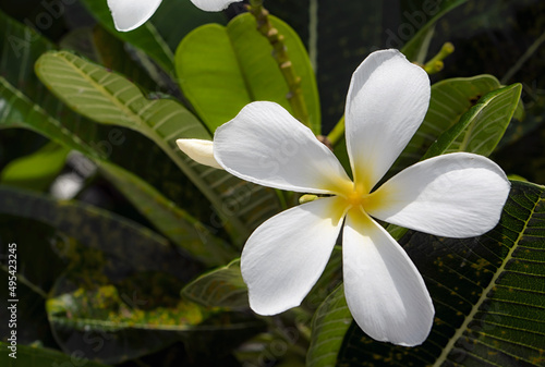 Frangipani Flower blooming in the summer with green back drop of leaves