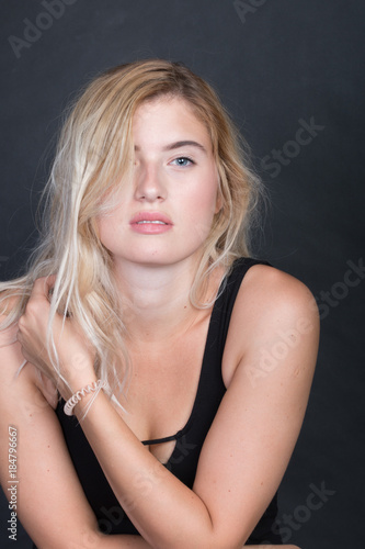 woman, girl, young, pretty, blond, lingerie, photo studio, model, sitting, chair, leg, foot, nylon, stocking, pantyhose, black, background, pose, fun, attitude, commercial