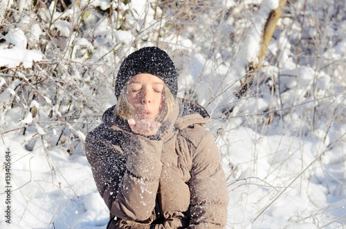 snow, woman, mother, blow, snowscape, wonderland, forest, cap, cold, winter, sun, sunshine, fun, game, enjoy, hand, dust, crystal