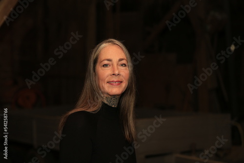 Frau in den besten Jahren Porträt. Scheune, lange Haare, best Ager, Silversister, 50Plus, über 50, Model, reife Frau, Silver Generation, Tattoo Model, Tattoo, graue Haare, closeup