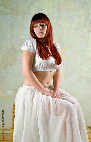 redheaded, woman, female, round, curve, belly, dress, fashion, waiting, portrait, bright, white, piercing, princess, positive, sad, sadness, depression, corporation, live, lively, attractive, pretty, beauty, tender, fragile, tulle, clothes, clothes, fashionable, red, red hair, indoor, dream, upright format, interior, transparent, european