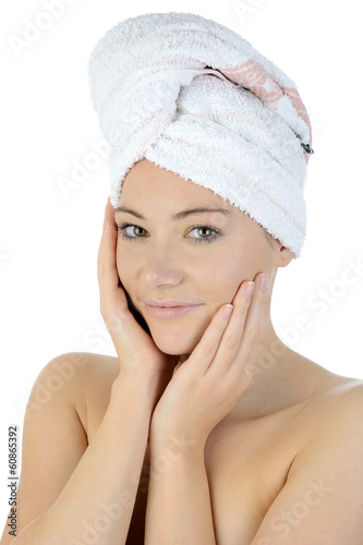 shower, showering, bathe, swimming, towel, sauna, woman, missy, turban, bodycare, bathe, wellness, relaxation, relax, bronzed, blond, blond, pretty, attractive, friendly, smile, smile, positive, well-being, welfare, care, cosmetic, fresh, refresh, no, background, studio, isolated, release, white
