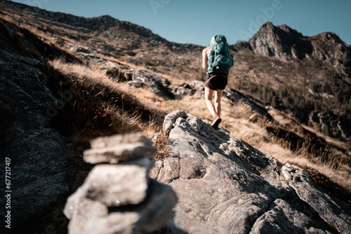 Frau-Bergsteiger mit grünem Rucksack steigt in den Alpenpfad hinauf in braunen Farben der Umgebung