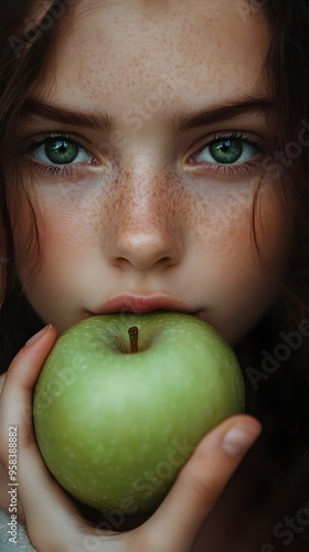 portrait, girl, freckle, green eye, apple, closeup, beauty, youth, innocence, natural, fresh, vibrant, serene, calm, detailed, skin, face, young, healthy, food, nature, fruit, human, expression, emotion, softness, tender, contrast, organic, freshness, gaze, contemplation, purity, high-coloured, lifestyle, calmness, texture, sharpened, delicate, model, outdoors, harmony, minimalism, aesthetic, visual, intimate, aethereal