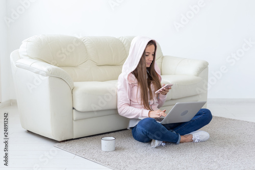 Freelance and people concept - Young woman sitting on floor and working at laptop