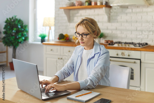 Freelance worker or businesswoman working remotely. Serious young woman in eyeglasses sitting at wooden kitchen table at home, using laptop computer, creating marketing strategy and business website