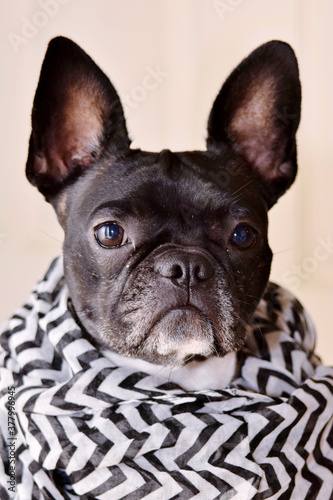 French bulldog wearing a black and white scarf