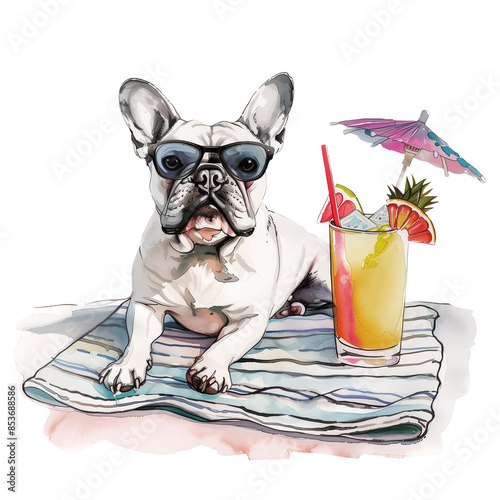 french bulldog, dog, pet, animal, lovely, adorable, cute, funny, summer, beach, sea, vacation, holiday, warm, hat, bulldog, french, puppy, white, isolated, canino, mammal, breed, portrait, brown, studio, doggy, domestic, black, purebred, small, white background, studio shot, cocktail, sunglasses